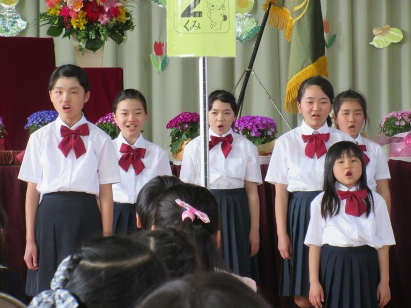 また、入学式終了後は、本校合唱部から歌のプレゼントがありました。「校歌」や「楽しい立野小」を美しい歌声で披露してくれました。とても心が和みました。合唱部のみなさん、ありがとうございました。