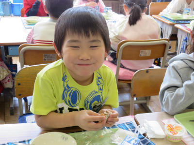 4月13日(金)入学してから4日が経ちました。今日は、慣らし給食の2回目です。マーブル食パン、牛乳、オレンジゼリーのメニューです。マーブル食パンは、「みんな模様が違う」「迷路みたい」と歓声が上がっていました。オレンジゼリーは、ちょっと凍っていて喉にさわやかでした。昨日より、配膳の仕方も牛乳パックの開け方も、ずっとずっと上手になりました。