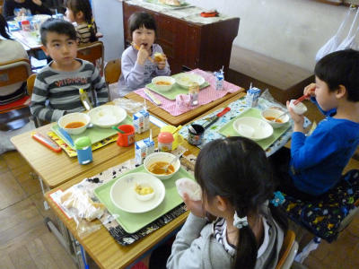 4月16日(月)慣らし給食に続き、今日から本格的に給食開始となりました。今日のメニューは「ツイストパン、牛乳、ポテトのチーズ焼き、アスパラサラダ、ミネストローネ」です。品数も量も増えました。時間の中で、食べきることも大切なことです。たくさん食べることができましたか?
