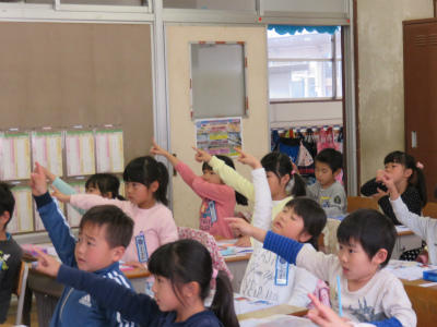 2組、3組は「国語」の授業です。ひらがなの「ち」のお勉強をしました。字形やはらいに気を付けて丁寧に書いています。先生のお話をよく聞いています。