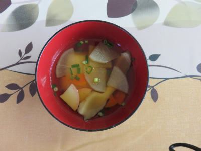 2月7日(木) 5年生は家庭科で「一番好きなだしを見つけよう」の勉強をしています。今日は、にぼし、昆布、かつお節、しいたけの中から好きなだしを選んで、お雑煮を作りました。食文化について、とても大切な学習になりました。校長室にも5年3組から「しいたけ」のだしで作ったお雑煮が届きました。しいたけの甘みを感じる、おいしいお雑煮でした。ごちそうさまでした。