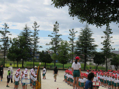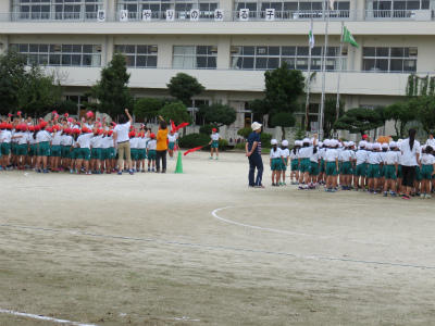 お昼頃、雨が上がり晴れ間が見えましたので、プラカード、国旗等の動きを代表児童が練習しました。