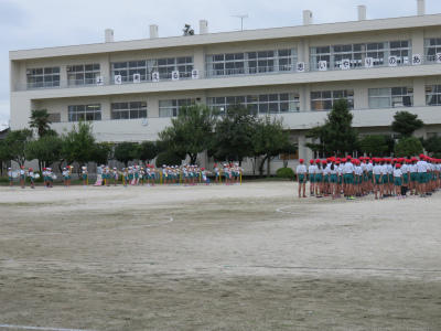 今週5日(月)から、運動会の練習が始まりました。今朝は全体練習の第1回目です。雨が降っていたので、体育館で練習を行いました。