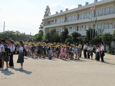 大増中学校の生徒が立野小学校に来て、合同の避難訓練を行いました。たくさんの中学生が小学生の下校班に入り、同じ地区や兄弟と一緒に帰りました。