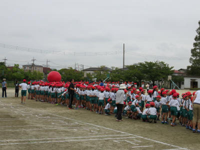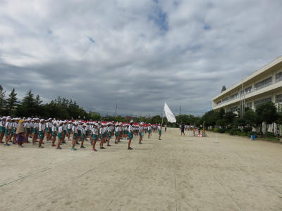 今週5日(月)から、運動会の練習が始まりました。今朝は全体練習の第1回目です。雨が降っていたので、体育館で練習を行いました。