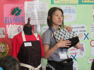 はじめに、作り方の説明を受けます。先生方は思い思いの生地を選びました。