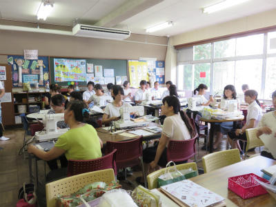 8月7日(月)「家庭科部会夏季研修会」が立野小学校で開催されました。暑い中ので研修会でしたが、優良教材様に御指導等をいただき、エプロン、和柄巾着づくりに挑戦しました。30名を超す先生方が意欲的に取り組んでいました。ミシン、手縫い、時には習う側になり、教える時のポイントを見直すいい機会となりました。市内の先生方、ご苦労様でした。なお、本校からは7名の先生方が意欲的に参加しました。