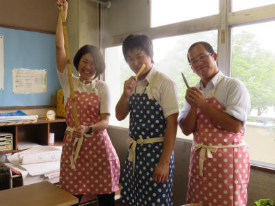 笑顔の3教諭です。色違いのエプロンが完成しました。
