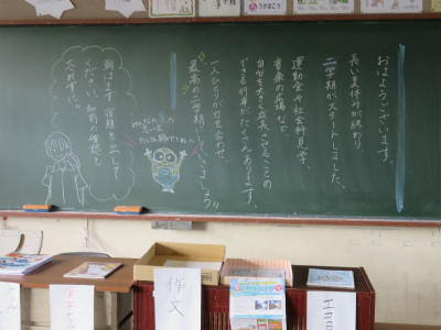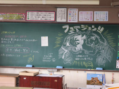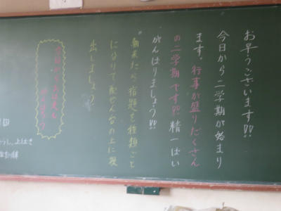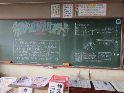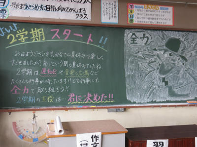 9月1日(金)いよいよ2学期のスタートです。朝、教室を回ると黒板がいつもと違っています。登校前の教室には、各担任からこんなメッセージがあります。立野小学校では、先生が首を長くしてみんなの登校を待っています。2学期も元気に、仲良く頑張りましょう。