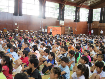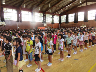 9月27日(水)朝、体育館において「10月のお話朝会」がありました。今日の校長先生のお話は、「先人の伝えた文化」についてです。秋空にはいわし雲、うろこ雲などが浮かんでいます。季節を感じる感性も育てていきたいものです。今日は、節をつけて「秋の七草」の暗唱にチャレンジしました。「おみなえし・すすきに・はぎに・ききょう・くず・ふ~じ~ばかま・な~でしこ」といった具合です。おうちに帰って、自慢しなさいと話しました。覚えられていたら、褒めてください。