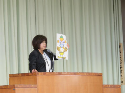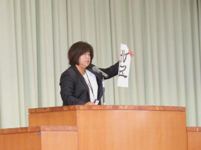 校長先生からは、花咲徳栄高校野球部監督の言葉を紹介し、「富士山に登るように一歩ずつ努力を重ねましょう」という話をしました。また、「登」という漢字の成り立ちを一緒に学びました。