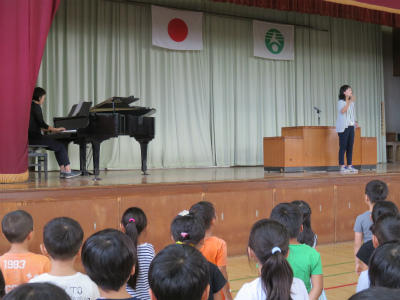 みんなの元気なあいさつが響きます。三嶋先生指揮、藤間先生伴奏により、校歌を元気よく歌うことができました。やはり学校にはみなさんの元気なあいさつと歌声が欠かせませんね。