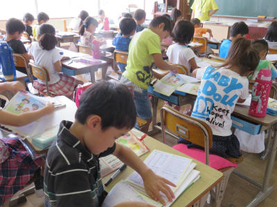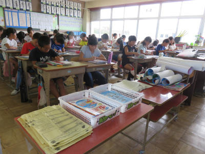 教科書も含め、たくさんの配布物がありました。プリントで明日の持ち物を確認したり、教材に名前を書いたりしました。2学期の準備はこれでOKですね。
