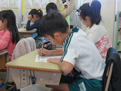 12月6日(水)1・2校時は4年生、3・4校時は5年生が体育館に於いて「校内競書会」を行いました。心を落ち着け、練習の成果を発揮する雰囲気が感じられました。