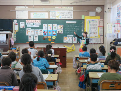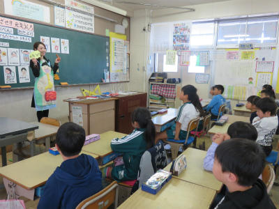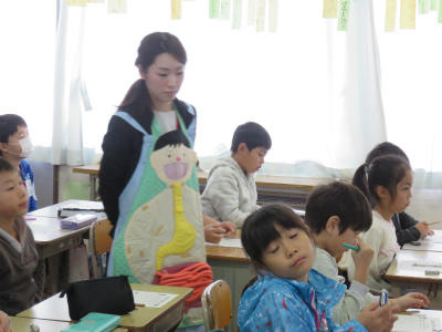 教育実習生の分須先生が2年1組で授業をしました。学級活動「めざせ!元気うんち」です。うんちが出ないので困ったことはないか、という問いに「イライラする」「お腹が痛くなる」など、自分の生活に密着した問題として、積極的に考えている様子が伝わりました。