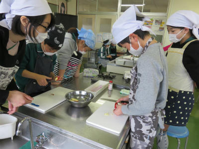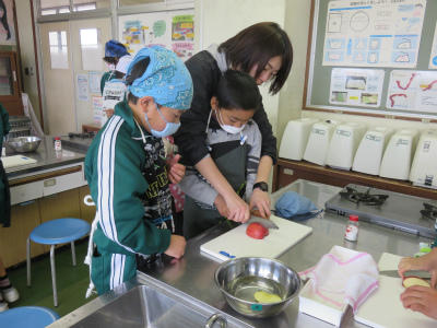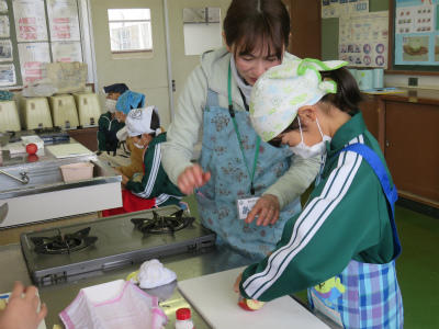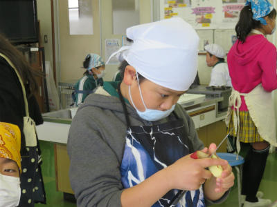 2月22日日(木)1校時から5年生全クラスが「リンゴの皮むき」に挑戦しました。家庭科の授業の一環として包丁を使っての「切り方」を学びます。
