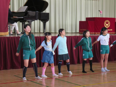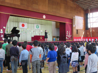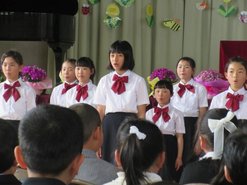 また、入学式終了後は、本校合唱部から歌のプレゼントがありました。「校歌」や「楽しい立野小」を美しい歌声で披露してくれました。とても心が和みました。合唱部のみなさん、ありがとうございました。