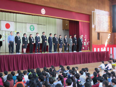 始業式に先立って、転退職された先生方の紹介、転入生の紹介を行いました。