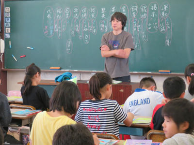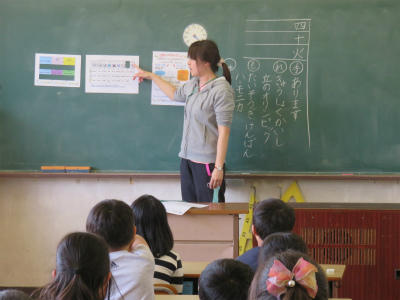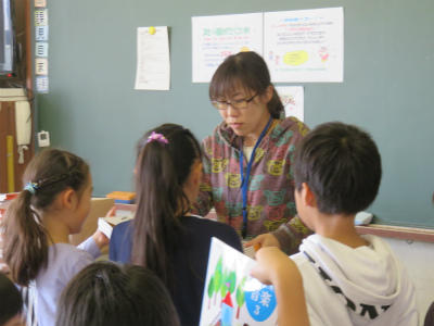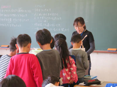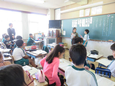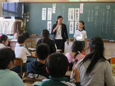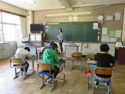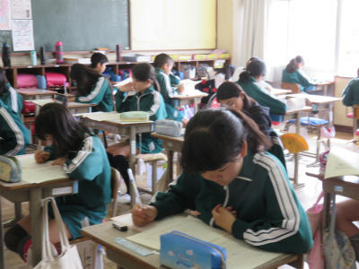 2組、3組は「国語」の授業です。ひらがなの「ち」のお勉強をしました。字形やはらいに気を付けて丁寧に書いています。先生のお話をよく聞いています。
