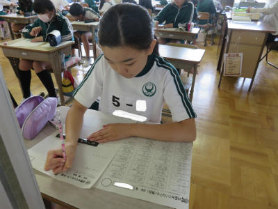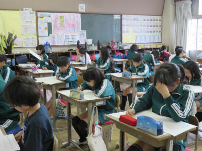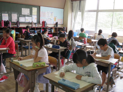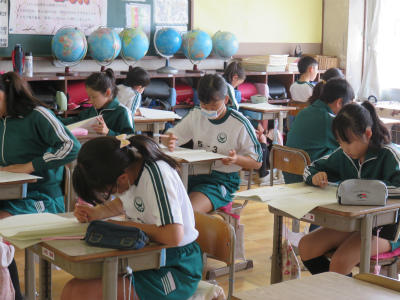 国語、算数、質問紙に取り組みました。学力向上は、本校は今年度も課題としています。個人の伸びを知る調査です。どの教室も真剣に取り組んでいました。