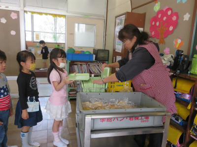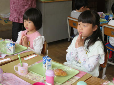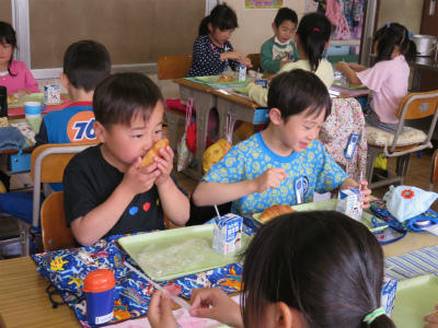 4月16日(月)慣らし給食に続き、今日から本格的に給食開始となりました。今日のメニューは「ツイストパン、牛乳、ポテトのチーズ焼き、アスパラサラダ、ミネストローネ」です。品数も量も増えました。時間の中で、食べきることも大切なことです。たくさん食べることができましたか?