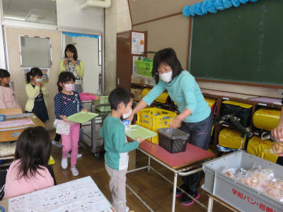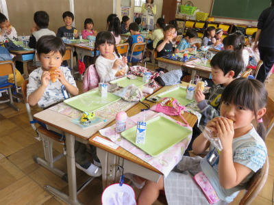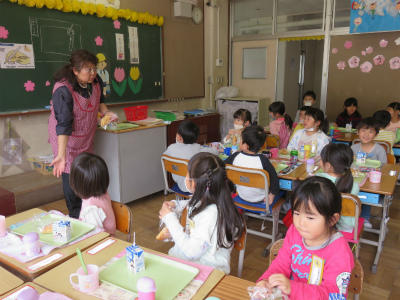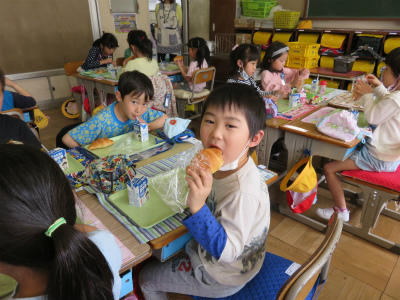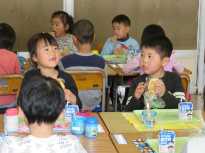 4月13日(金)入学してから4日が経ちました。今日は、慣らし給食の2回目です。マーブル食パン、牛乳、オレンジゼリーのメニューです。マーブル食パンは、「みんな模様が違う」「迷路みたい」と歓声が上がっていました。オレンジゼリーは、ちょっと凍っていて喉にさわやかでした。昨日より、配膳の仕方も牛乳パックの開け方も、ずっとずっと上手になりました。