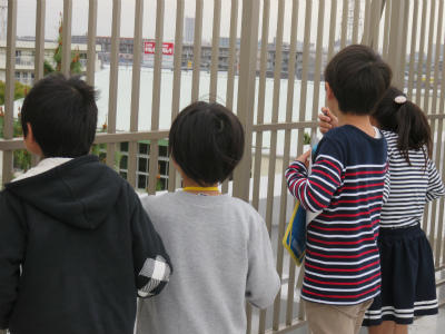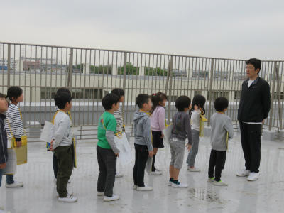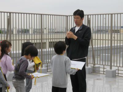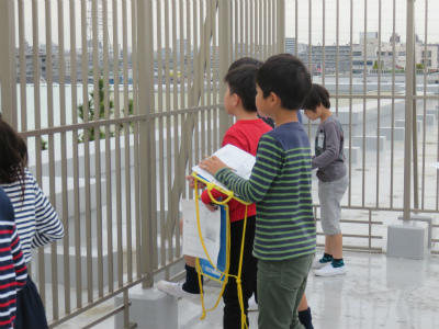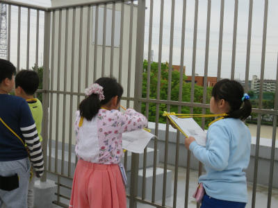 4月17日(火)3年生は、社会科の学習で屋上から見えるものを調べました。担任の高岡先生から校庭は南、と教えられました。北の方角には島忠が、東の方角にはイトーヨーカドーが見えました。自分の家を探したり、近所のマンションが見えたりしました。