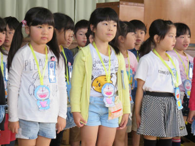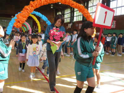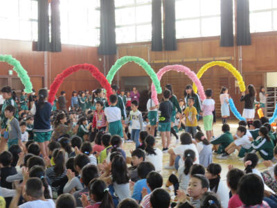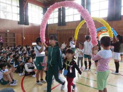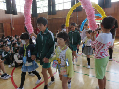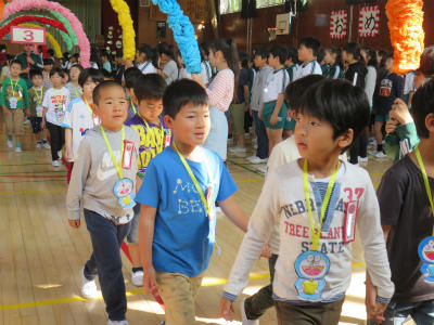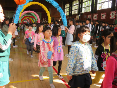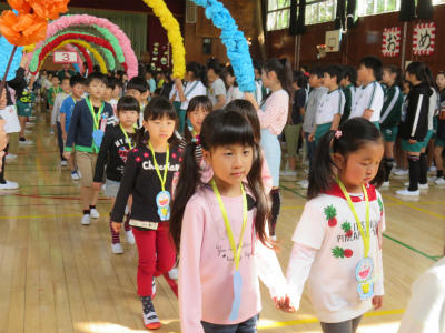 4月19日(木)朝、体育館において「入学おめでとう集会」が開かれました。6年生に手をつないでもらって1年生が入場します。色とりどりのアーチを持っているのは5年生です。胸にはドラえもんのメダル。お兄さん、お姉さんが一生懸命準備しました。