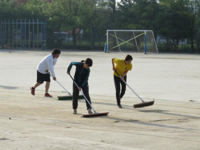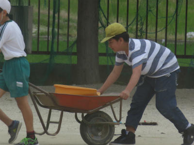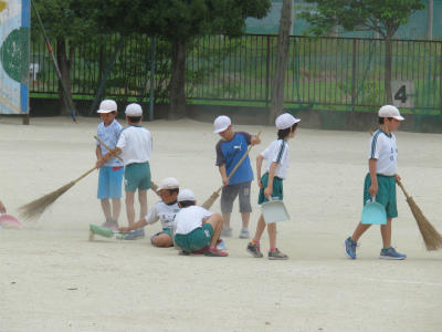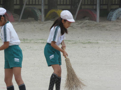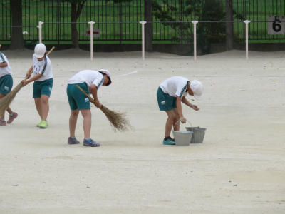 5月30日(水)明日は、いよいよ市内陸上大会です。今日は、高学年のみなさんに大きな力をなっていただきました。校庭の砂を丁寧に取り、掃き清めました。大会では、選手のみなさんがベストコンディションで競技に集中できるように、会場校としての心を表そうと話しました。黙々と一生懸命に校庭整備に励む姿に、立野っ子の心意気を見ました。(実は、このあと豪雨に見舞われてしまうというアクシデントがありました。)