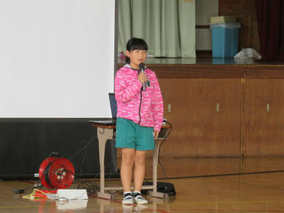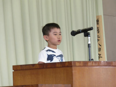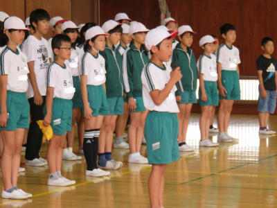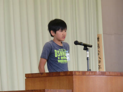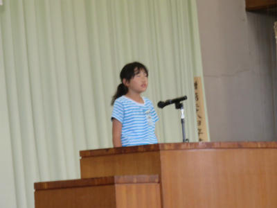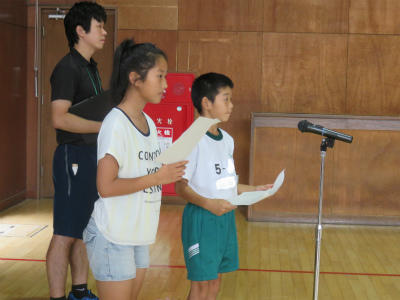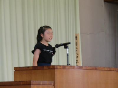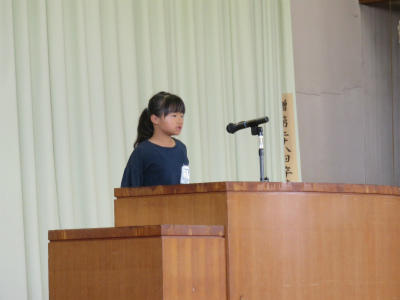 また、各学年の児童からそれぞれ「プール開きに寄せての決意」が述べられました。「クロールができるようになりたい」「ルールをしっかり守って学習したい」「先生の指導をしっかり受けて、去年の記録を上回りたい」など、具体的な目標を堂々と述べることができました。大変立派な態度でした。