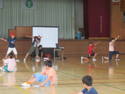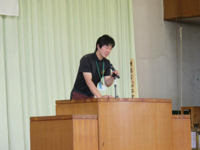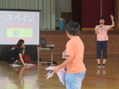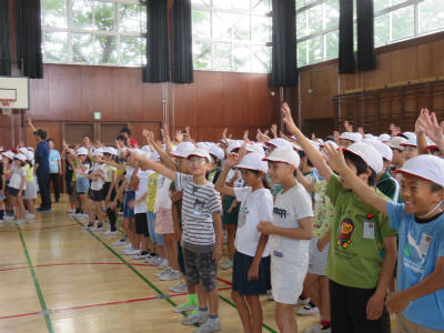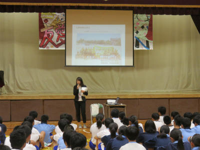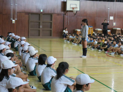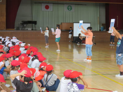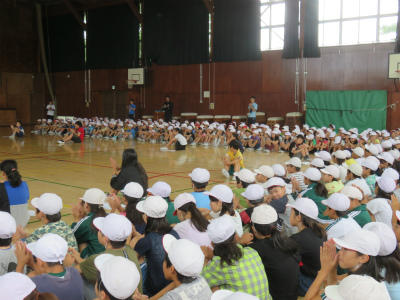 6月13日(水)今日は児童朝会です。体育館でEnglish集会が開かれました。今年度より立野小には英語専科の先生が配置されています。