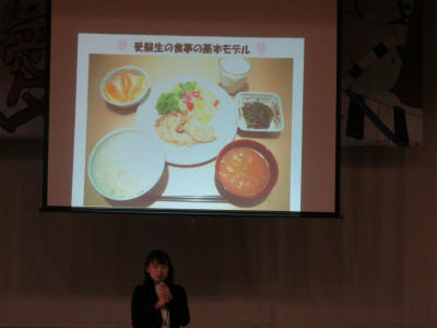 6月1日(金)9:30~大増中学校体育館において、本校栄養教諭による出前授業が実施されました。今年度、本校と大増中は「つながる食育」事業の委託校ととなっています。今日は、中学校3年生を対象に「勉強に効果的な食事」についての学年集会に参加させていただきました。