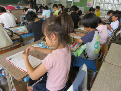 6月7日(木)、今日もたくさんの子どもたちが、「校長検定」に挑戦しました。2年生でも「平家物語」をすらすら暗唱します。黄色い紙はミニ賞状。20枚集めると金メダルがもらえます。1度にいくつもの暗唱にチャレンジし、合格する子どもも増えてきました。おうちでおじいちゃんやお母さんと暗唱している、と話してくれる子どももいます。