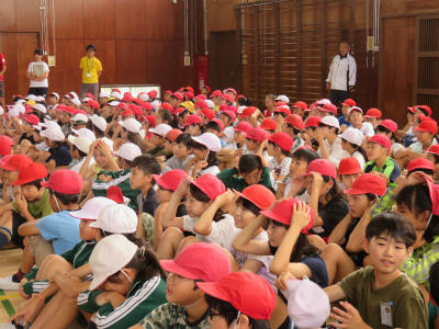 6月1日(金)朝、体育館において「プール開き」がありました。いよいよ水泳学習が始まります。校長からは「安全に学習すること」「目標をしっかり持つこと」の2点を話しました。気のゆるみが大きな事故につながることがあります。約束をしっかり守って、実りある水泳学習にしましょう。