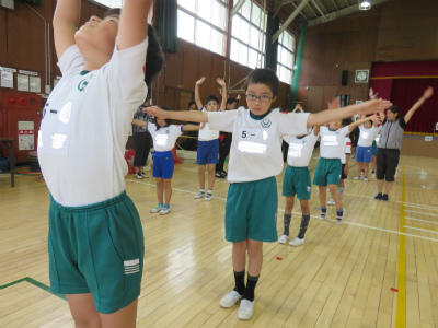 今日は、「二択クイズ」「世界のじゃんけん紹介」に取り組みました。「二択クイズ」は、写真を見て、その場所が日本にあると思ったら赤帽子、海外にあると思ったら白帽子にする、というものです。平野先生が英語でリードしましたが、1年生もしっかり理解してクイズに参加していました。また、「世界のじゃんけん紹介」では、大きな声で活動していました。楽しかったね。