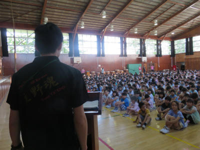 6月13日(水)今日は児童朝会です。体育館でEnglish集会が開かれました。今年度より立野小には英語専科の先生が配置されています。