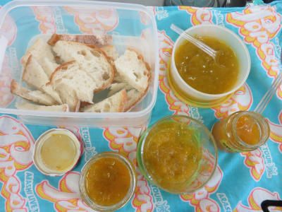 6月12日(火)校庭に大きな梅の実がたくさんなりました。熟れて落ちてしまうものもあり、急いで収穫をしました。先生方で少しずつ持ち帰り、梅ジャムを作りました。レシピは、校長の大変いい加減な、目分量の、しかも口頭で言い放ったものです。今日、たくさんの先生方が梅ジャムを持ち寄りました。同じ梅の実から作ったのに、味はいろいろ、色もいろいろ。レシピがアバウトなものですから仕方ないですか。でも、だから面白いですね。
