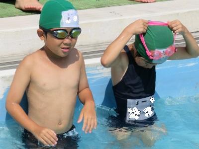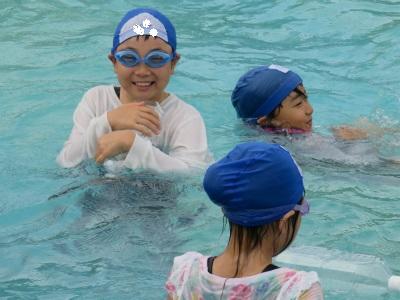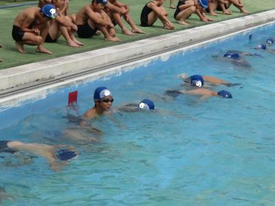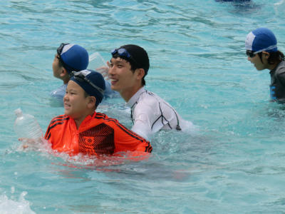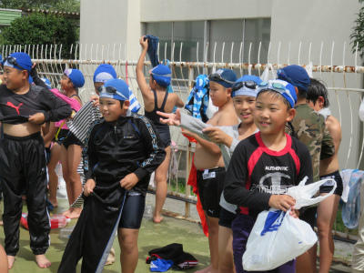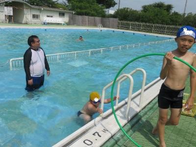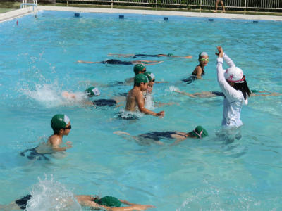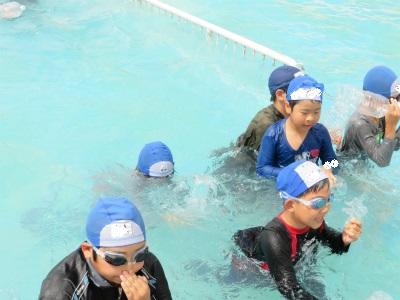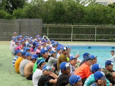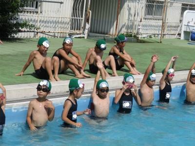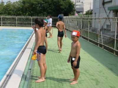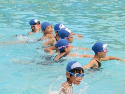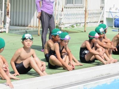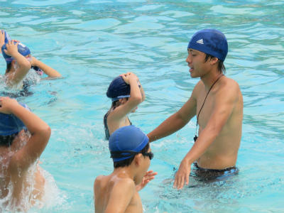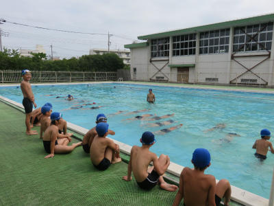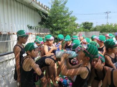 今朝は、春日部も例年の気温だということで、暑さもかなり和らいだように感じました。プールサイドが熱せられるので、水を撒いて対応しています。また、休憩をこまめに取り、水分補給の時間を確保しています。元気な声が響いています。
