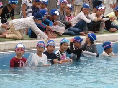 7月24日(火)9:00~3年生のプール学習がありました。昨日、メール配信をしました。暑さがことのほか厳しい状況なので、時間を短縮しています。また、20分ごとに、水分補給の時間を設定しています。水筒の冷たい水で、潤います。水の中では思わぬ発汗があるようです。注意しましょうね。
