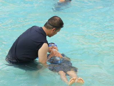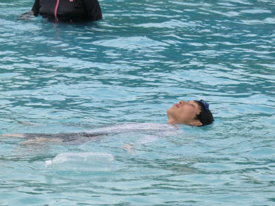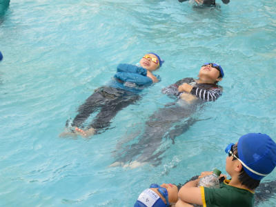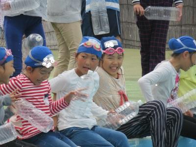長袖、長ズボンを着用してからプールに入って歩いてみると、「重い」「進めない」「わかめみたい(?)」。衝撃的だったようです。水に落ちたら、決して慌てず、体力を温存することを学びました。あおむけになり、ペットボトルを抱えてみました。みんな上手に浮くことができました。