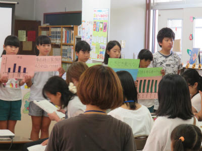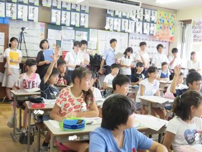 7月5日(木)東部教育事務所による「校内研修を支援する学校訪問」において、5年2組岩見教諭による研究授業(国語)がありました。本校は、「国語」についての校内研修を重ねており、本時は『5年2組新聞記者大賞はだれ?~みんなが納得する新聞を書こう「見立てる」「生き物は円柱形」』の授業を行いました。