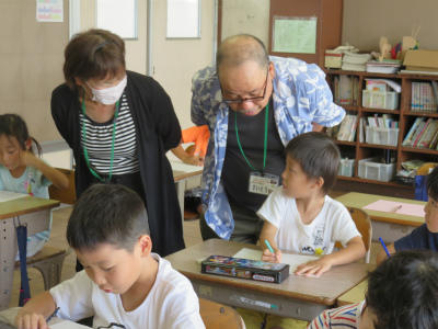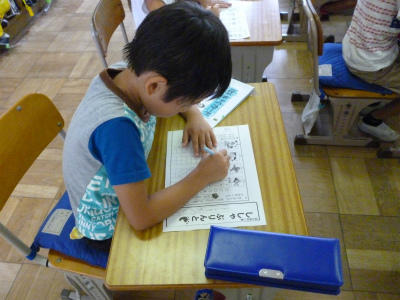 7月12日(木)朝、ステップの時間を使って、全校で視写プリントに取り組んでいます。本校は、国語についての研究を進めています。「視写」をすることで、文字への注意力、集中力、文章の読み取りの力の育成などを目指しています。書く姿勢や、正確に写すことを担任が声掛けしています。1年生の学級ととなかよし学級では、静寂の中、集中して取り組んでいる様子が見えました。