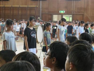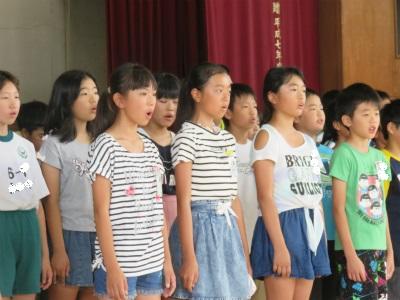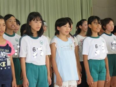 7月11日(水)朝、体育館において「音楽朝会」がありました。今月の歌は「翼をください」です。今日は、6年生が全校児童の前で歌声を披露しました。澄み渡る素晴らしい歌声です。子どもたちにいつも話していますが、先輩が頑張ることで「自分の行く先が見える」学校が素晴らしい学校だと思っています。6年生になったら、きっとあんなに素敵な歌が歌えるんだ、と下の学年の子どもたちは思ったことでしょう。額に汗しながら、髪に汗が染み入るようになりながら、堂々と歌った6年生に感謝です。素晴らしい音楽朝会でした。ありがとうございました。