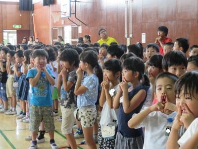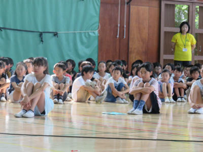 7月30日(月)13:00~4年生となかよし学級のプール学習がありました。午後は、時々日差しが強くなり、例年どおりの気温、水温になりました。まずは、体育館で準備体操をし、先生のお話をよく聞きます。今日も、熱中症予防のため時間を短縮し、休憩を随時とりながら水筒の飲み物を補給しました。元気いっぱいの立野っ子です。