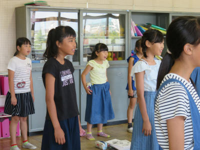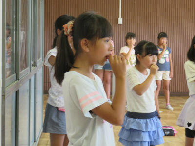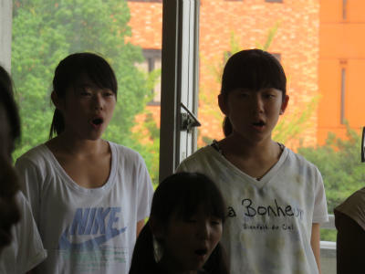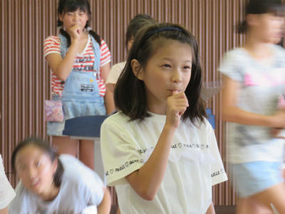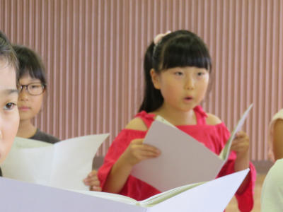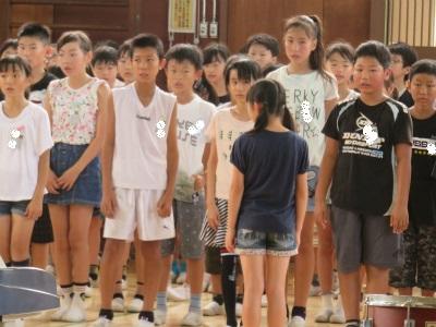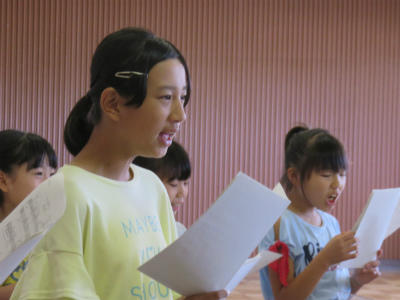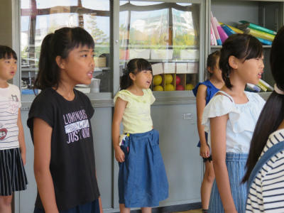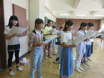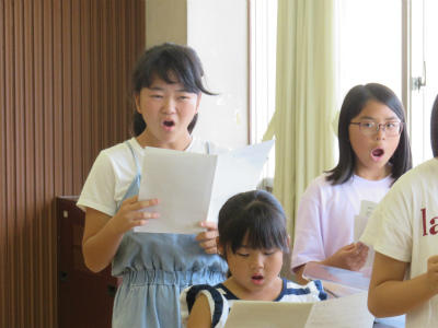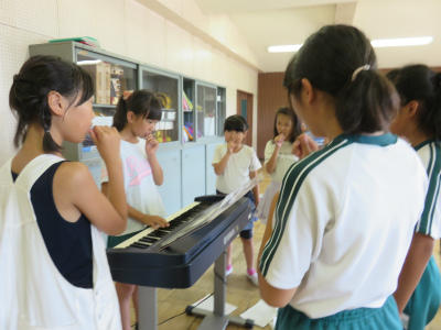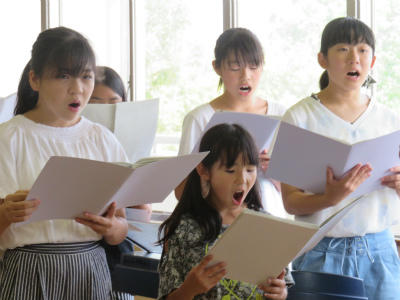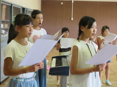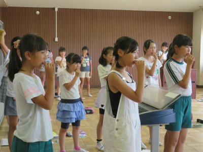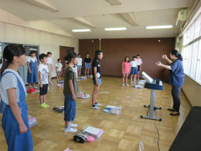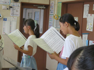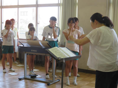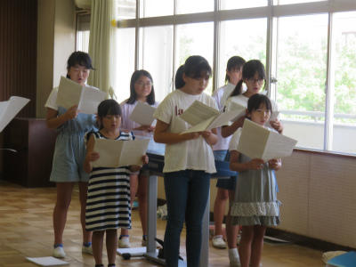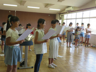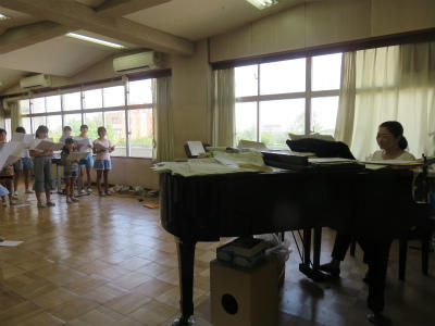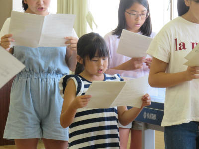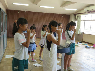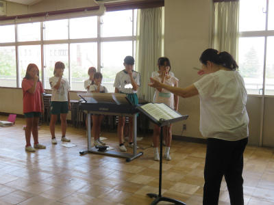 7月25日(水)14:00~合唱部の練習が始まりました。今日も5年生がいないので、少し広く感じる音楽室でした。