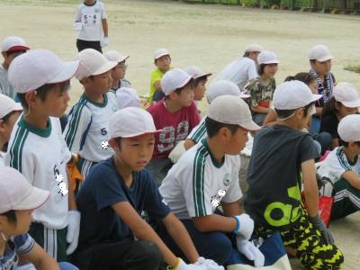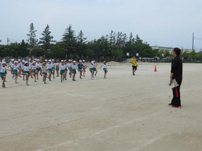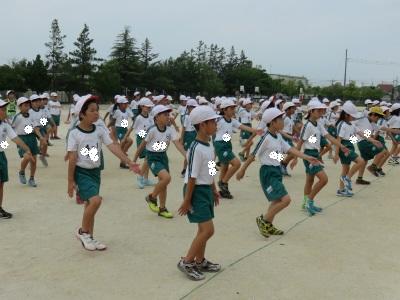 7月19日(木)1校時、校庭において4年生の体育(集団行動)の授業が行われました。今朝も気温が高く、「おは走」は中止となりました。4年生の体育も20分間と時間を限定して行いました。運動会での表現「集団行動」の練習です。短時間で集中して取り組みました。きびきびした動きができあがってきました。