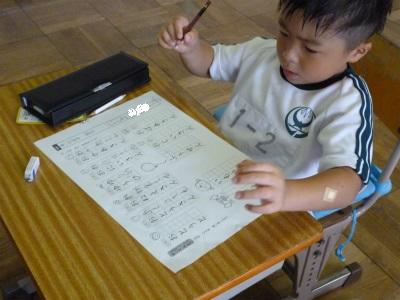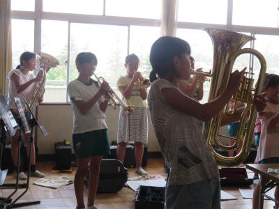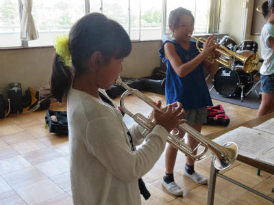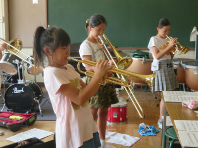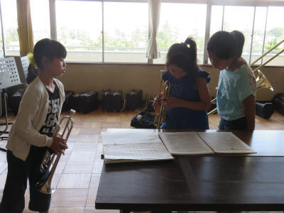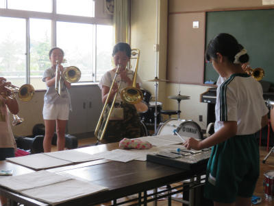 音楽室から金管の音色が聞こえてきます。今日は、5年生が林間学校に行っているので、練習はしていないはず・・・、と思って覗いてみました。3人だけの練習でしたが、一生懸命やっています。さすが立野っ子。手は抜きませんね。運動会の曲が音色よく響いています。猛暑の中、ありがとう!!