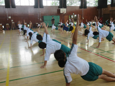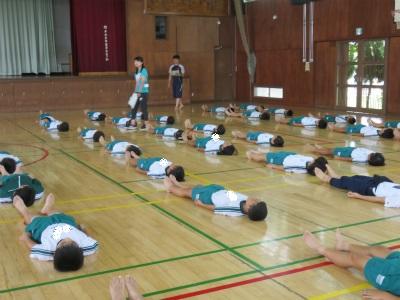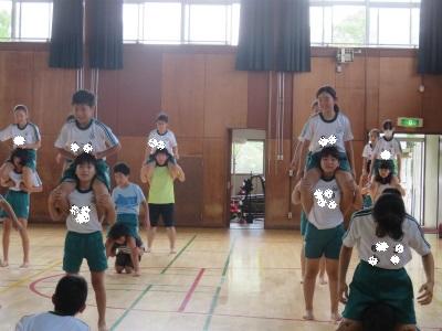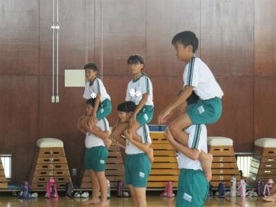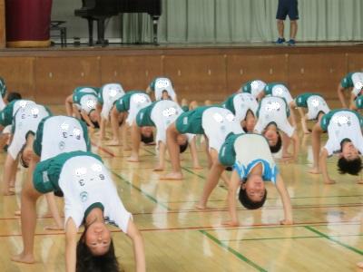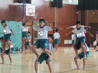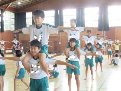 7月13日(金)3校時、体育館において6年生の「組体操練習」が始まりました。9月15日(土)の運動会に向けての練習です。まずは、個人技、続いて2人組。「気をつけ」の姿勢が案外一番難しい、と先生から声がかかりました。