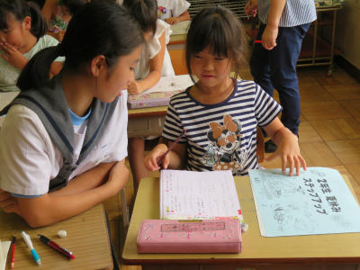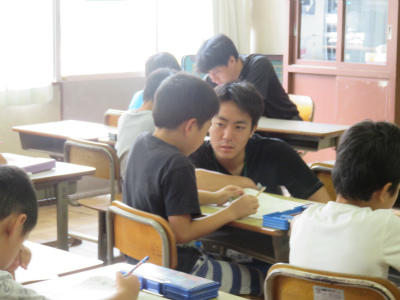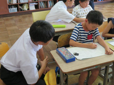 7月23日(月)ステップアップ教室が開かれました。普段の授業では、質問しにくいこともステップアップ教室では、積極的に挑みます。今日は、大増中学校から6名のお兄さん、お姉さんが教えに来てくれました。ありがとうございます。わかりやすく、丁寧に教えていただきました。子どもたちも俄然やる気になります。