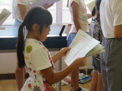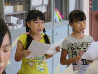 7月24日(火)もう夕刻です。音楽室からは、合唱部の美しい歌声が響いてきます。今日は、5年生が林間学校に出かけました。いつもより10名ほど少ない人数での練習です。みんないい顔をしています。和久先生の指導にも熱が入ります。「立野小に文化の香りを!」